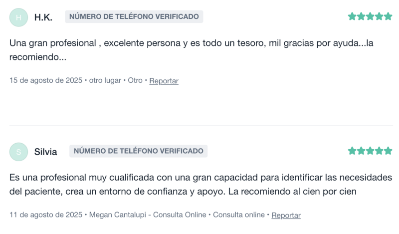 En estas experiencias de mis pacientes se refleja la empatía, la transformación y el bienestar que busco ofrecer a cada persona y progenitor que confía en mi acompañamiento terapéutico.